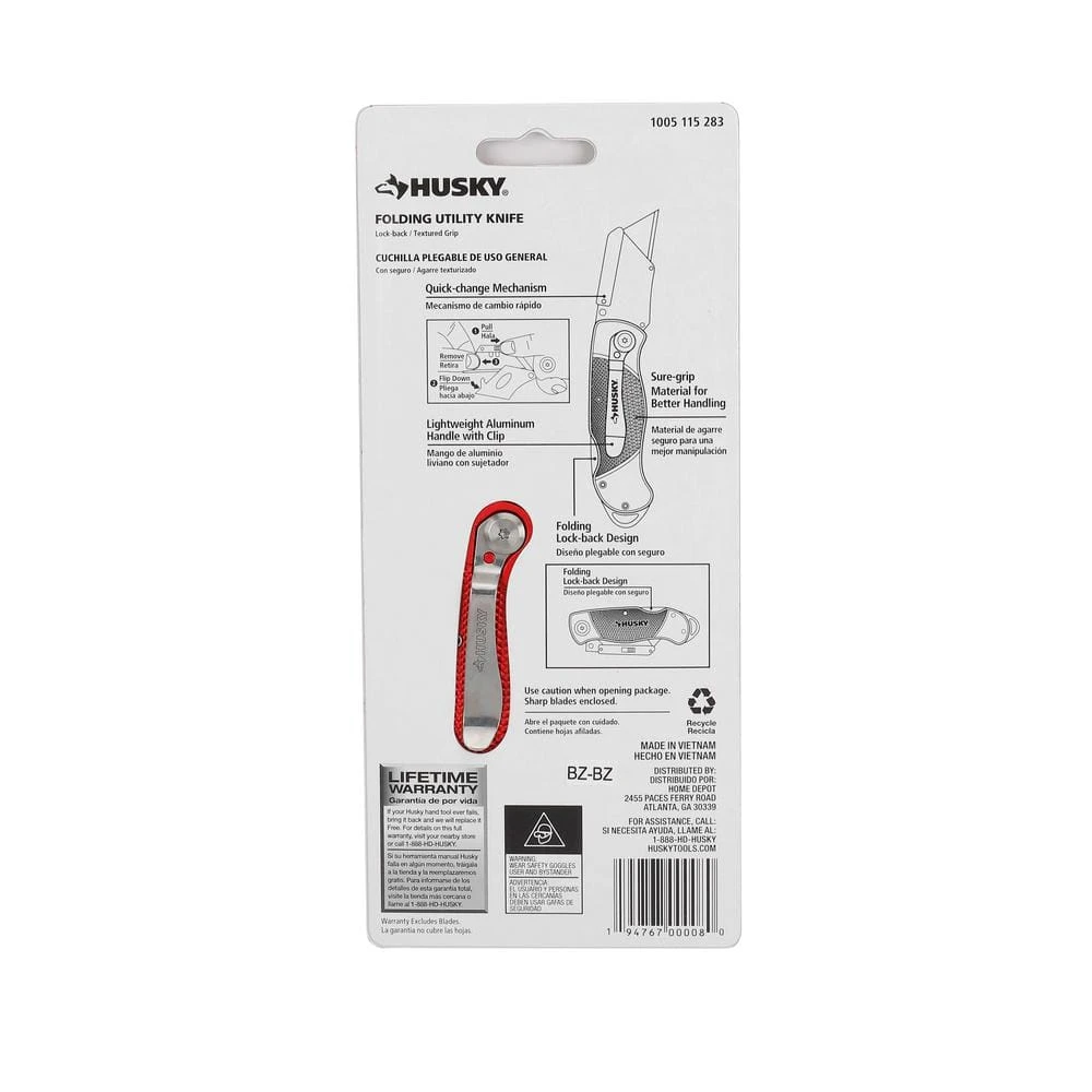 Husky Folding Lock-Back Utility Knife locks in place for efficient cutting. The handle is crafted of aluminum for strength. The knife features a folding design to help ensure safety. Includes 10-blades. All Husky hand tools are backed by a -the best in the industry. In the unlikely event that a Husky tool breaks, we’ll replace it free of charge. See product packaging for details.