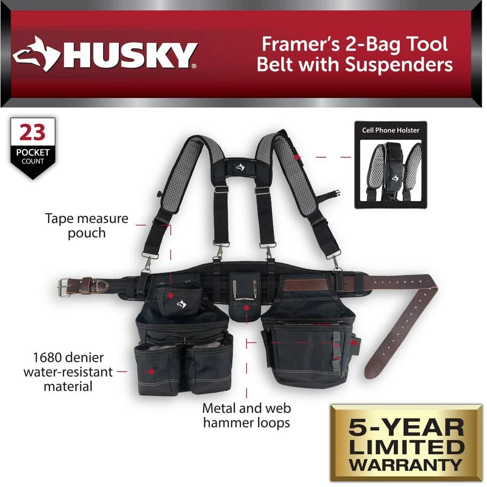 Husky continues to bring excellence to the jobsite. The all-new Husky Framer’s Two Bag Tool Belt with Suspenders is ready for the pro. This tool belt includes features and materials that will ensure long lasting use over time, while providing the ideal configuration you will need on the jobsite. Leather features on the belt are upgraded to ensure longevity, while giving a great look. The padded suspenders are breathable and allow moisture to wick away. You won’t be able to find a better tool belt out there, so be sure to add this all-new Husky tool belt to your collection today.