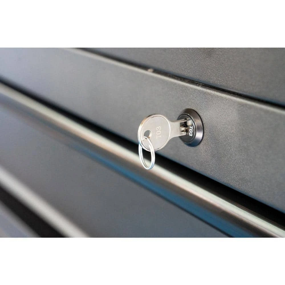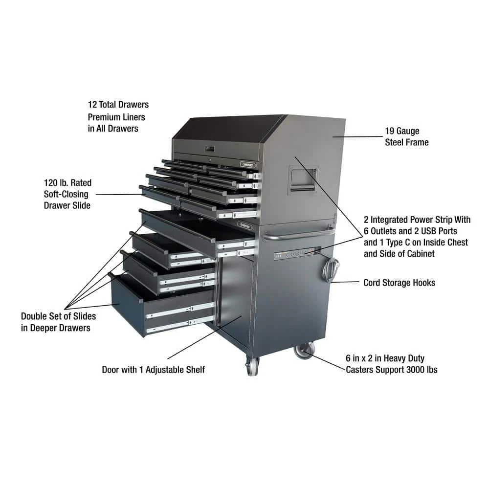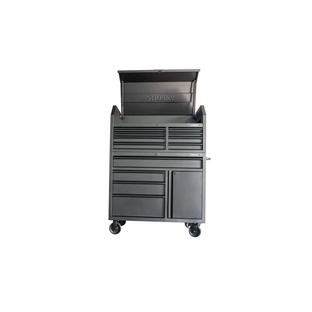 The Husky 46 in. W, 24.5 in. D with 12-drawers and 1 door Tool Chest and Cabinet Set is a heavy-duty, 19-Gauge steel, tool storage unit that is rated for 2,000 lbs. weight capacity. This tool chest and cabinet set with 12-drawers provide 11,683 cu. in. of storage. The heavy-duty drawers are rated to 120 lbs. each. The extra deep bottom drawers have double 120 lbs. glides. The full length drawer provides convenient storage for longer items and the small drawers keep smaller items in a confined space. Drawer liners are included to protect and keep your tools in place. This unit is equipped with 2 power centers that have 6 outlets, 2 USB and 1 USB-C ports, making it easy to keep all of your tools charged. For added security, both the chest and cabinet are fitted with a key and lock system. This toolbox weighs in at 439.6 lbs. so the 6 in. x 2 in. heavy-duty industrial grade casters with easy locking pedals that can smoothly role around your work area. The locker area has 1 shelf inside to store larger items.