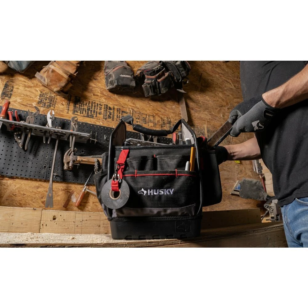 Built for the PRO, the 10 in. Tool Tote that is built for the PRO. The tote is constructed of durable 1680D Polyester, reinforced ripstop pockets and waterproof hard base to withstand everyday jobsite use. The 10 in. opening, removable wall and quick-disconnect handle allow for visibility and easy access to your tools. The 10 in. Tool Tote includes an easy-access tape clip, tape roll tether, and 40 total pockets to organize a variety of tools.