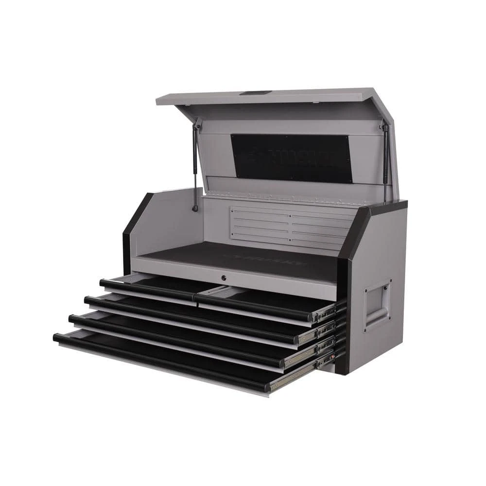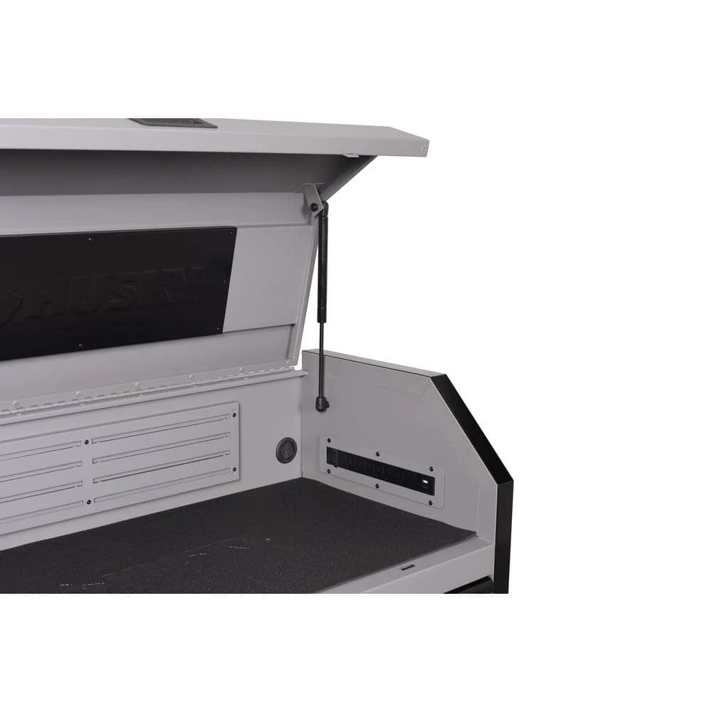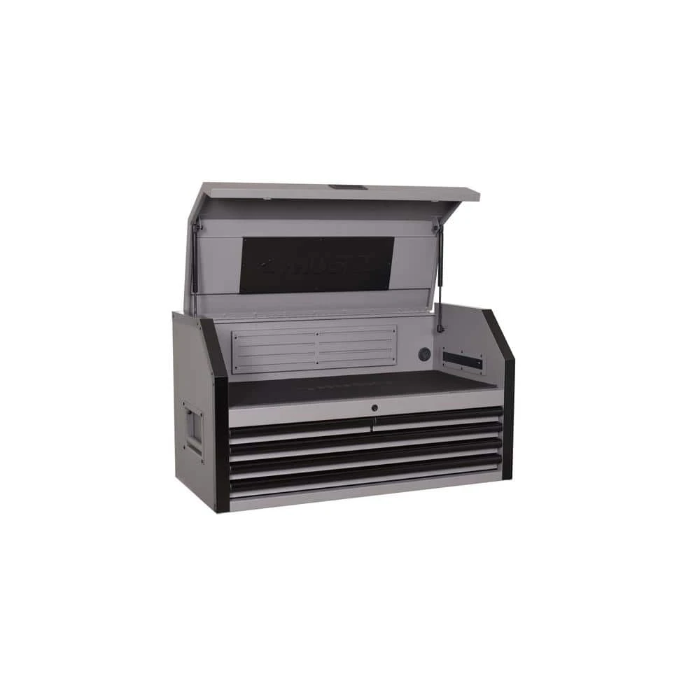 The Heavy Duty 42 in. W 5-Drawer Matte Gray Top Tool Chest has arrived. This chest is constructed of 19-gauge steel and finished with a matte gray powder coat. The unit is equipped with soft-closing 100 lb. rated ball-bearing slides to ensure drawers do not slam closed. Each drawer also has a pre-cut thick liner embossed with the Husky logo. Inside the top till is an integrated power strip with 6 outlets, 1 USB-A, and 1 USB-C port to charge tools, batteries, and other electronic devices.