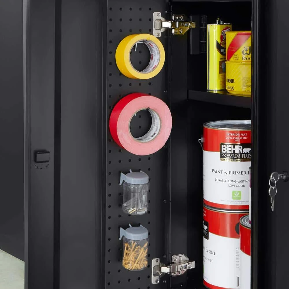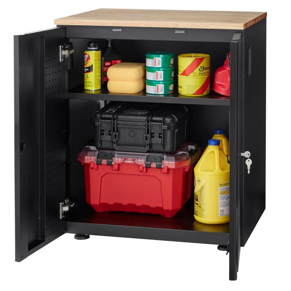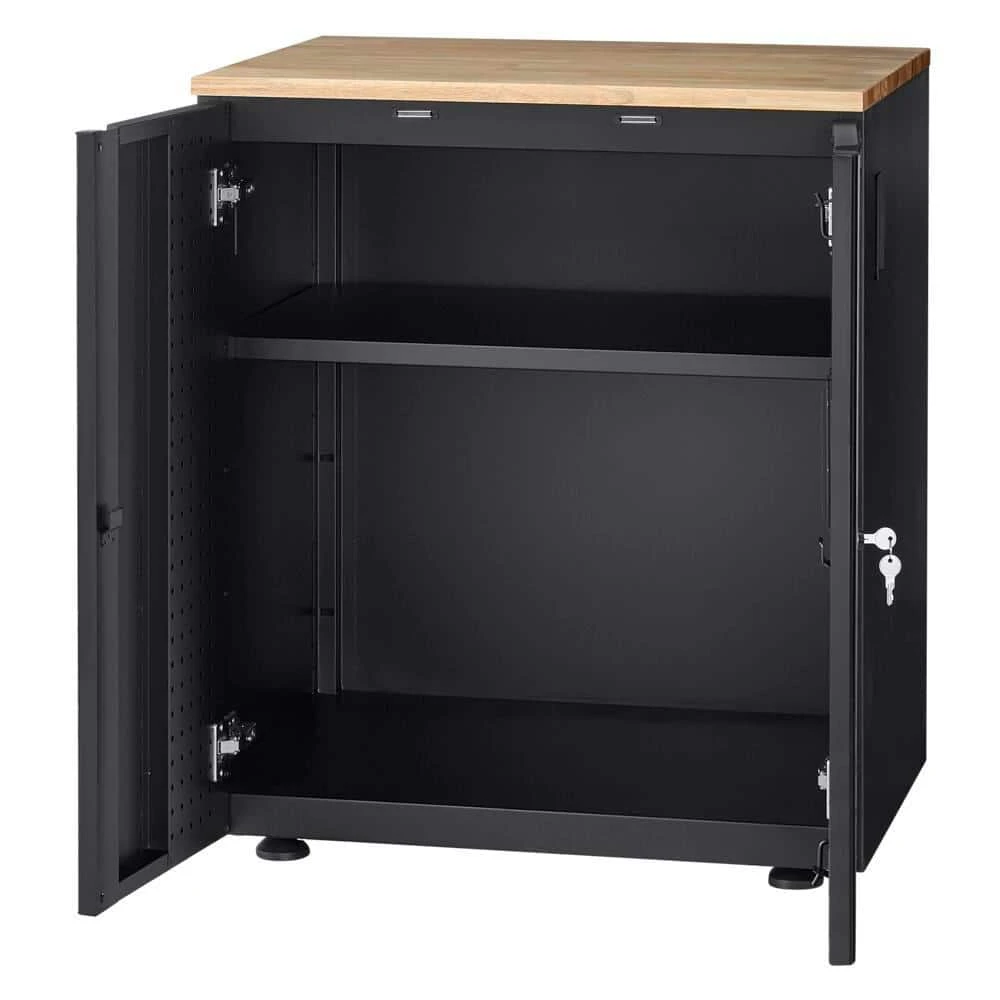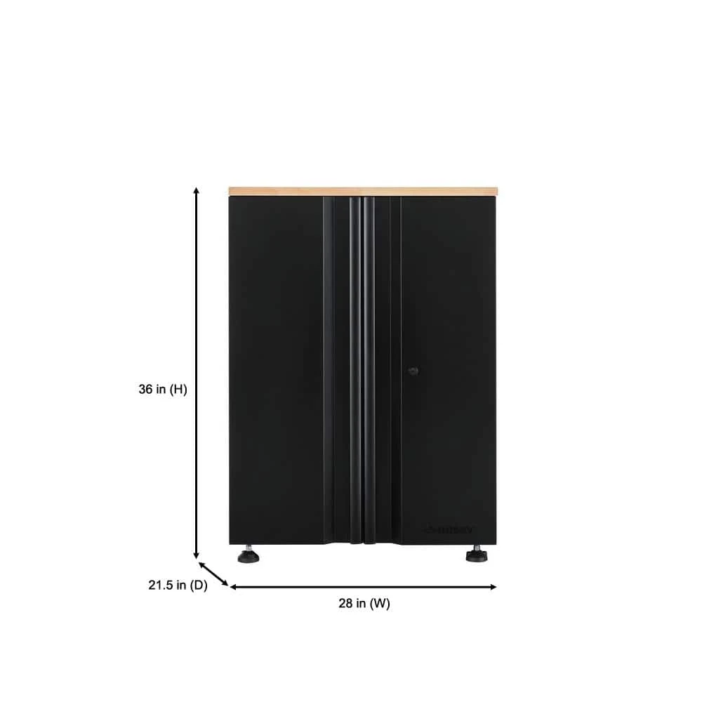 Easily store and protect your tools and other important items with this Heavy Duty Welded 20-Gauge Steel Two-Door Garage Base Cabinet in Black (28 in. W x 32 in. H x 21.5 in. D). It features a holding capacity of up to 1,000 lbs. This is a durable design for your space. It is resistant to scratching and has a chemical-resistant finish