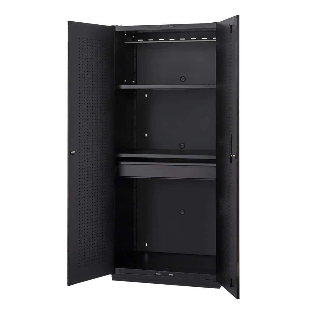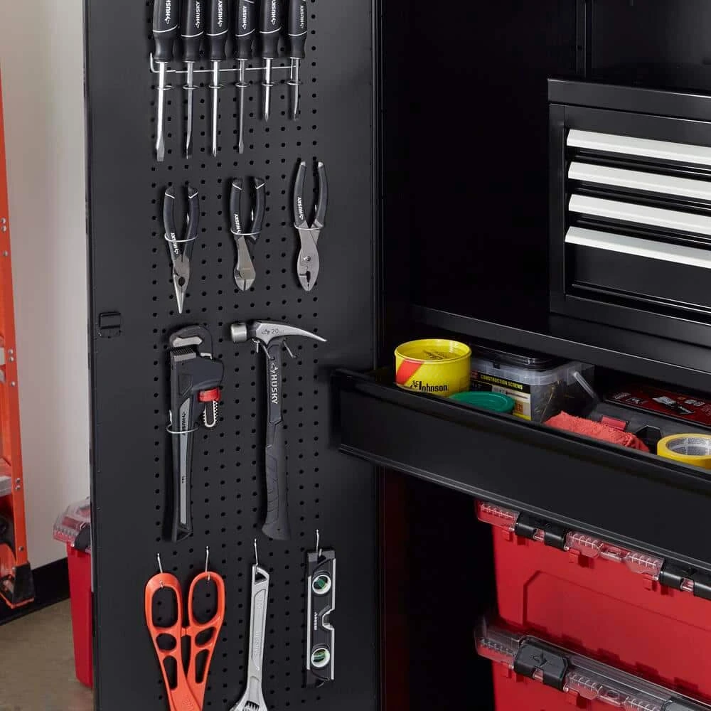 Organize your garage, workspace, basement and more with this Husky Steel Freestanding Cabinet. It features a black finish on the 24-gauge steel to match the rest of your cabinetry and it has adjustable shelves inside, so you can customize it to meet your needs. It also includes lockable doors, an adjustable drawer and cord gromets.