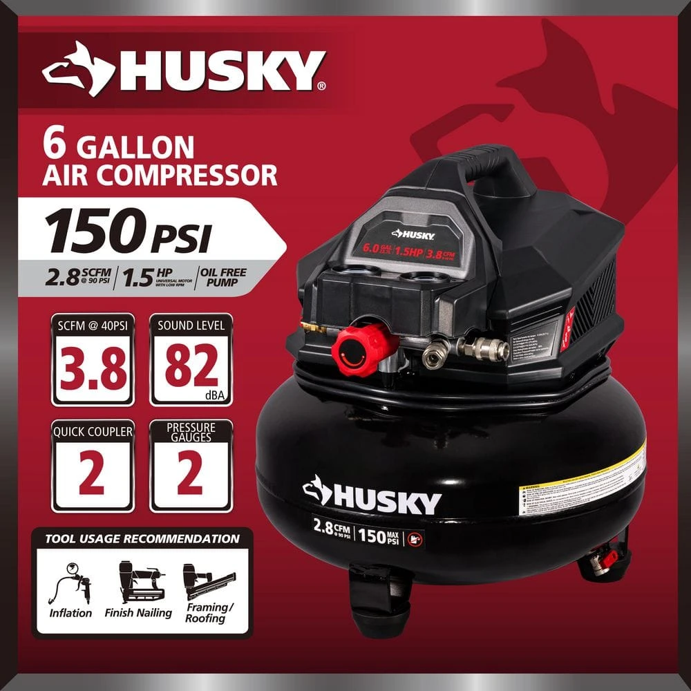Husky 6 Gal. Pancake Air Compressor and Brad Nailer Combo KitPower up your projects with the Husky 6 gal. 150 MAX PSI Portable Pancake Air Compressor and 18-Gauge Brad Nailer Combo Kit, complete with a 25 ft. air hose for ultimate convenience.-Reliable Performance: The compressor’s 1.5 HP motor delivers 150 PSI max pressure, with 3.8 SCFM at 40 PSI and 2.8 SCFM at 90 PSI, ensuring fast, consistent power.-Low Maintenance Oil-free design for hassle-free operation, plus a built-in drain valve to prolong tank life. Versatility: quick couplers and dual gauges for easy tool connections and precise control. Rubber feet ensure stability, and the carry handle makes it portable. Brad Nailer Excellence: The 18GA nailer features oil-free operation, depth adjustment, dry-fire prevention, and tool-free jam clearing. Its compact nose design and ergonomic grip enhance accuracy and comfort.- Complete Combo: Includes a 25 ft. air hose, making it a perfect all-in-one solution for trim work, cabinetry, and more.Get professional-grade performance with the Husky Combo Kit-built for durability and precision.