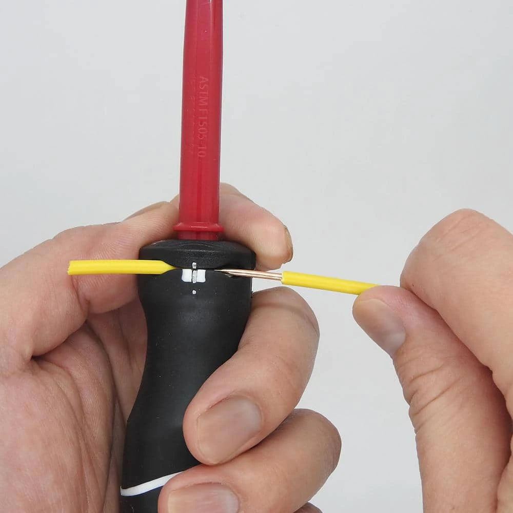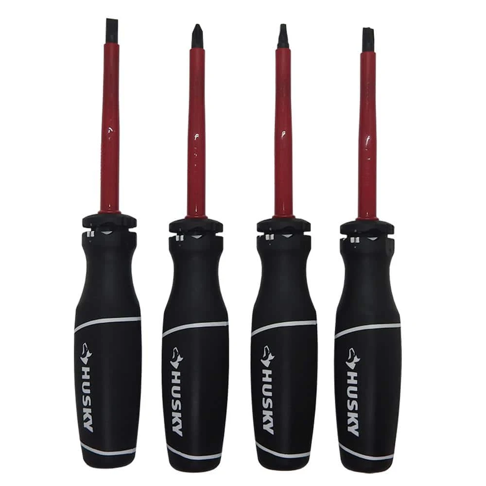 The Husky 4-Piece Insulated Screwdriver Set includes 1 slotted screwdriver, 1 Philips screwdriver, 1 Square screwdriver and 1 Combo Tip screwdriver for your fastening work. The handle is new designed cushion grip handle to provide greater torque and increased comfort, with a unique design to eliminate grip slippage during high-torque applications. The tip size markings are hot stamped on the end of the handle for easy identification, while the alloy steel blades are heat treated for strength and the precision formed tips ensure an accurate fit to limit cam-out. The patented design of wire stripper and wire bending function are very useful and convenient on 12 AWG and 14 AWG for electrician and DIYer. Husky insulated screwdriver exceeds IEC 60900 and ASTM F1505 standards for insulation.