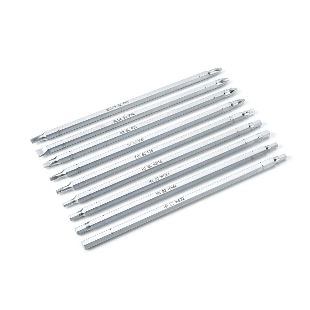 - Set contains 9 dual-ended bits in hex 3mm, 4mm, 5mm, 6mm, 3/16