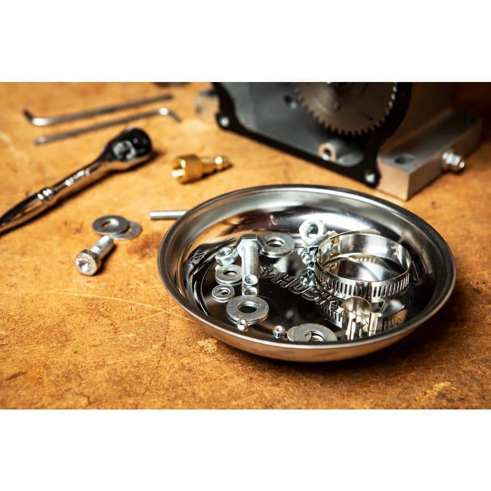 Keep all those loose nuts, screws, bolts, and other small parts in one place while working on projects with the Husky magnetic parts bowl. This 5-1/2 in. steel bowl uses a powerful magnet to keep both itself securely in place on any metal surface as well as any metal fasteners placed in the bowl from falling out. This magnetic parts bowl is perfect for any auto repair work or DIY projects where you need to keep track of nuts, bolts, and screws.