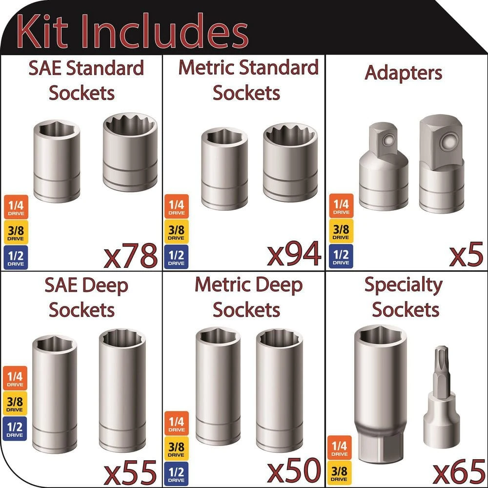 - Set includes: (116) 1/4 in. drive sockets, (2) 1/4 in. drive adapters, (134) 3/8 in. drive sockets, (2) 3/8 in. drive adapters, (92) 1/2 in. drive sockets, (1) 1/2 in. drive adapter