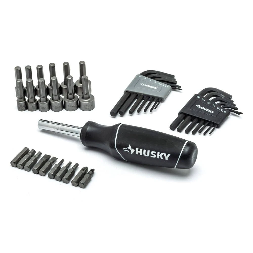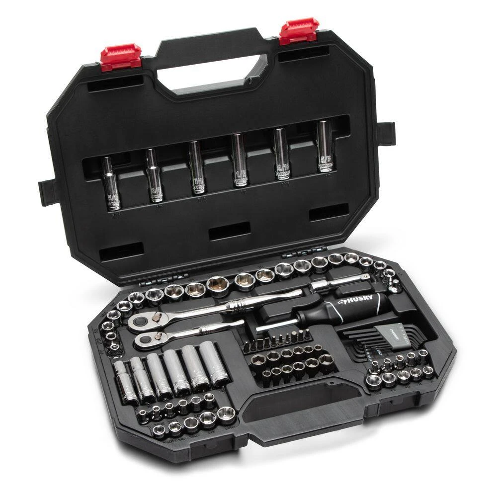 The Husky 94-Piece Mechanics Tool Set is a perfect set for the home DIYer or professional mechanic. The 53 different standard and deep sockets allow you to tackle a range of general fastening or repair projects. Sockets feature chamfered lead-ins to help provide fast and easy placement onto drive tools and fasteners. Set also includes 37 accessories, two extensions, two ratchets, and a storage case to keep it all organized. Compact and versatile for nearly any job, this mechanics tool set features an assortment of 1/4 in. and 3/8 in. drive sockets as well as accessory and drive tools for ultimate convenience. The 72-tooth ratchets need only 5ยฐ to turn a fastener, for hard to reach areas. For a complete product listing, see specification document.