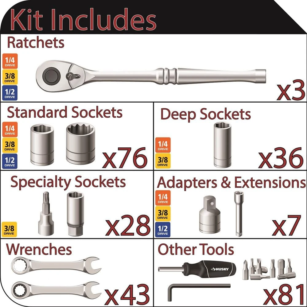 The Husky 274-piece 1/4 in., 3/8 in. and 1/2 in. drive mechanics tool set offers a comprehensive selection of tools for the professional or DIY mechanics workshop. The wide variety of standard and deep sockets along with an assortment of combination wrenches, ratcheting wrenches and bit sockets will allow you to tackle any fastening or repair project. Husky ratcheting wrenches feature a 12-point design to help prevent fastener damage and increase torque. A durable, polished chrome finish provides corrosion resistance for a lifetime of use while an alloy steel construction provides long-lasting performance. Wrenches have box-end design for additional leverage and to prevent slipping on hard-to-remove fasteners. Ratcheting box end needs only a 5ยฐ arc to turn a fastener, making hard-to-reach areas more accessible. This tool set will provide the novice or professional with a huge assortment of durable and reliable tools to get the job done. Comes packed in portable EVA foam storage trays to keep your tools organized inside your toolbox.