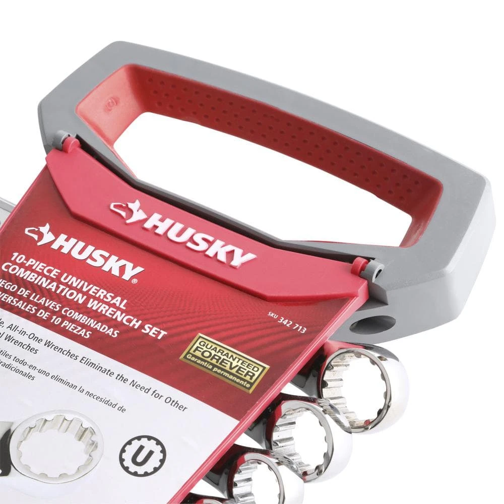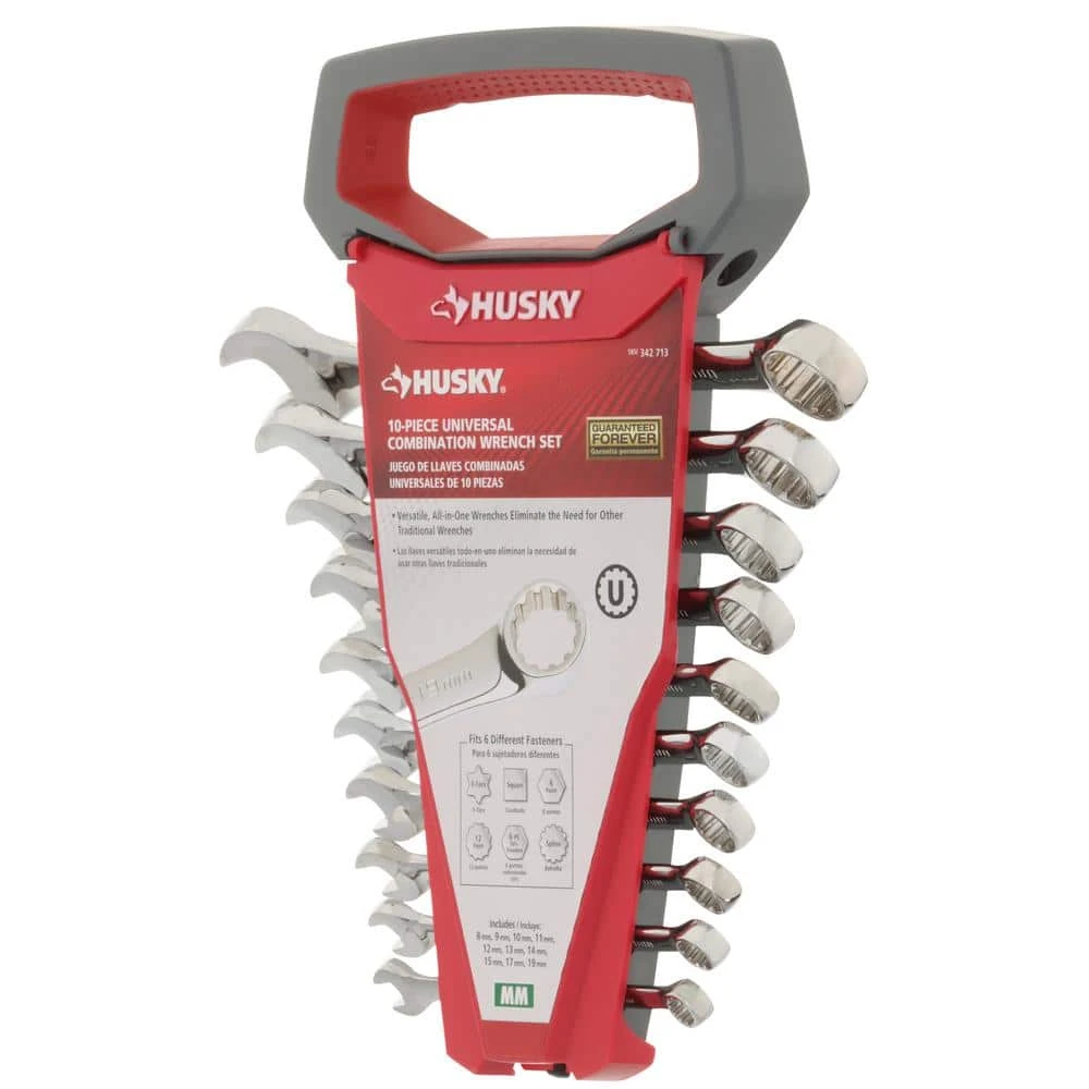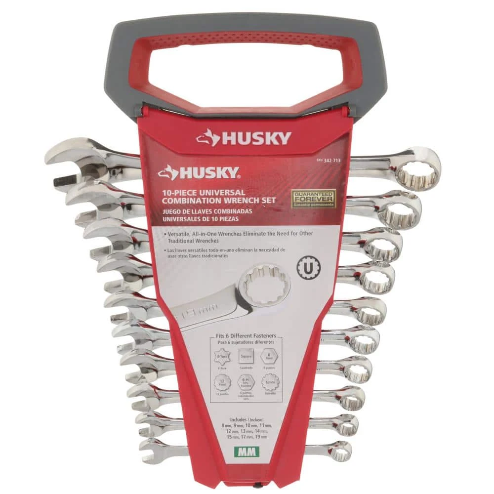 The Husky 10-Piece Metric Universal Combination Wrench Set is constructed of alloy steel for strength and long-lasting performance. The universal box-end fits 6-point, 12-point, square, E-Torx, Spline, and partially rounded hex fasteners. The full polish chrome finish helps protect the wrench for rust and corrosion.