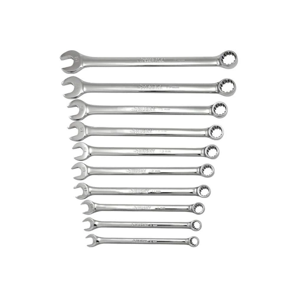 - Set includes 10 wrenches covering sizes 8 mm, 9 mm, 10 mm, 11 mm, 12 mm, 13 mm, 14 mm, 15 mm, 17 mm, 19 mm