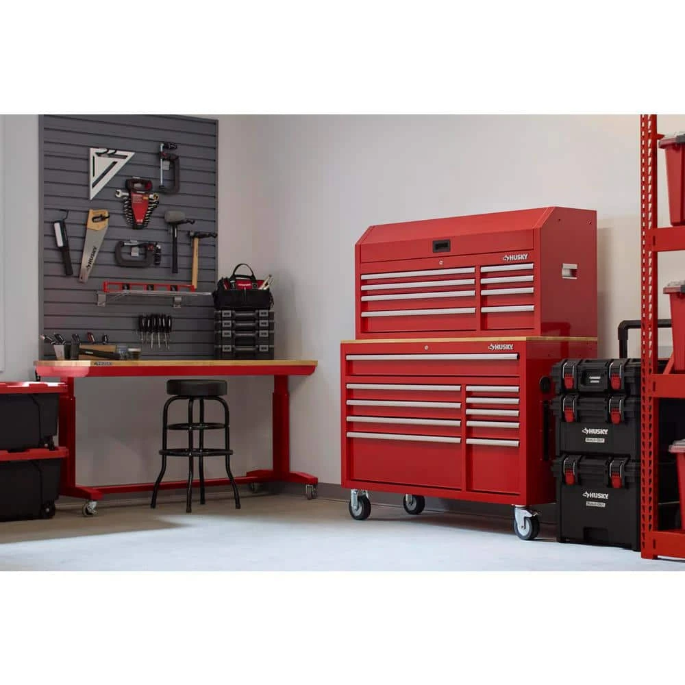 The Husky Modular 52 in. W 10-Drawer Red Mobile Workbench Cabinet with 8-Drawer Top Tool Chest is part of a system that allows you to customize your own steel storage configuration. This particular combo consists of the 52 in. 10-Drawer Mobile Workbench and 52 in. 8-Drawer Top Tool Chest. Both components are constructed of an all-welded 21-Gauge steel frame and the workbench has a 3/4 in. solid wood top. Eighteen drawers of varying sizes enable one to find the right place to store and organize all your tools, parts and supplies. All drawers have a pre-cut liner and are equipped with 100 lbs. rated ball-bearing slides that feature a soft-closing mechanism that ensures your drawers do not slam closed. There are integrated power strips with 6 outlets and 2 USB ports in both the top till and side of the workbench that will enable you to charge your tools and other electronics. Finally, one can easily move the workbench around the workspace on 5 in. x 2 in. casters with the large ergonomic push handle. This Husky Modular 52 in. W 10-Drawer Red Mobile Workbench Cabinet with 8-Drawer Top Tool Chest will be a great addition to your workspace on its own or combined with the additional modular components.
