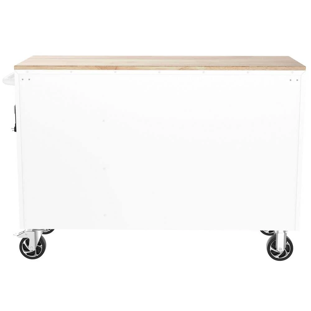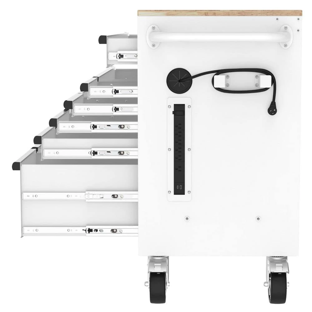 The Husky Modular 52 in. W 10-Drawer White Mobile Workbench is part of a system that allows you to customize your own steel storage configuration. The modular system consists of the mobile workbench, top chest, pegboard and side locker (all components sold separately). The mobile workbench is constructed of an all-welded 21-Gauge steel frame and a 3/4 in. solid wood top. 10 drawers of varying sizes enable 1 to find the right place to store and organize all your tools, parts and supplies. All drawers have a pre-cut liner and are equipped with 100 lbs. rated ball-bearing slides that feature a soft-closing mechanism that ensures your drawers do not slam closed. On the side of the unit is an integrated power strip with 6 outlets and 2 USB ports that will enable you to charge your tools and other electronics. Finally, 1 can easily move the workbench around the workspace on 5 in. x 2 in. casters with the large ergonomic push handle. This Husky 52 in. 10-Drawer White Mobile Workbench will be a great addition to your workspace on its own or combined with the additional modular components.