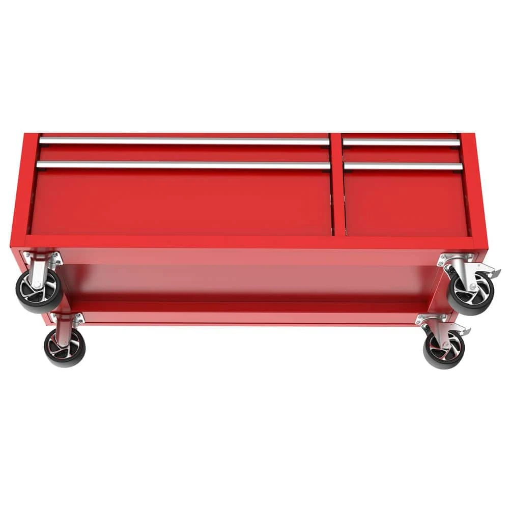The Husky Modular 52 in. W 10-Drawer Red Mobile Workbench is part of a system that allows you to customize your own steel storage configuration. The modular system consists of the mobile workbench, top chest, pegboard and side locker (all components sold separately). The mobile workbench is constructed of an all-welded 21-Gauge steel frame and a 3/4 in. solid wood top. Ten drawers of varying sizes enable 1 to find the right place to store and organize all your tools, parts and supplies. All drawers have a pre-cut liner and are equipped with 100 lbs. rated ball-bearing slides that feature a soft-closing mechanism that ensures your drawers do not slam closed. On the side of the unit is an integrated power strip with 6 outlets and 2 USB ports that will enable you to charge your tools and other electronics. Finally, 1 can easily move the workbench around the workspace on 5 in. x 2 in. casters with the large ergonomic push handle. This Husky 52 in. 10-Drawer Red Mobile Workbench will be a great addition to your workspace on its own or combined with the additional modular components.