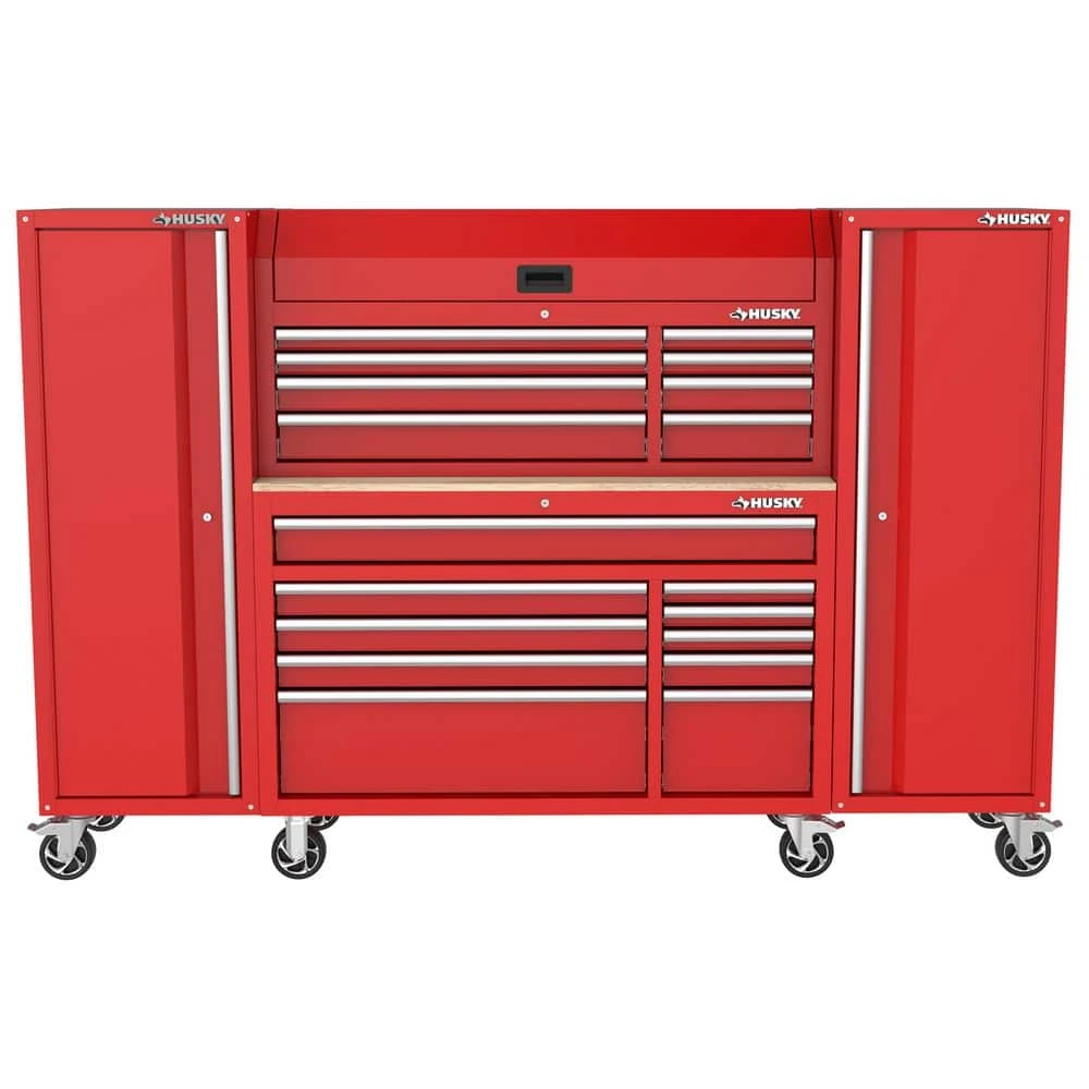 Husky Modular 52 in. W 10-Drawer Red Mobile Workbench Cabinet with 52 in. W 8-Drawer Top Chest and (2) 20 in. Side Lockers is part of a system that allows you to customize your own steel storage configuration. This particular combo consists of the 52 in. 10-Drawer Mobile Workbench, 52 in. 8-Drawer Top Tool Chest and (2) 20 in. Side Lockers. All components are constructed of an all-welded 21-Gauge steel frame and the workbench has a 3/4 in. solid wood top. All drawers have a pre-cut liner and are equipped with 100 lbs. rated ball-bearing slides that feature a soft-closing mechanism that ensures your drawers do not slam closed. There are integrated power strips with 6 outlets and 2 USB ports in both the top till and side of the workbench that will enable you to charge your tools and other electronics. The side lockers each have 3 adjustable height shelves that will allow you to configure the storage to best fit your needs. The inside of the doors has peg hook holes to organize hanging tools and supplies. 2 grommets will allow you to pass any cords into the locker. Finally, 1-can easily move the entire system around the workspace on 5 in. x 2 in. casters with the large ergonomic push handle. This Husky Modular system will be a great addition to your workspace on its own or combined with the additional modular components.
