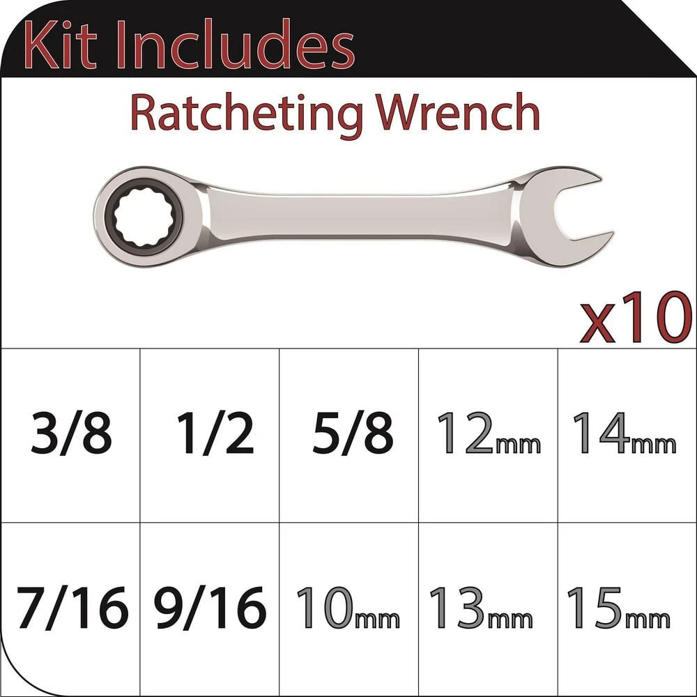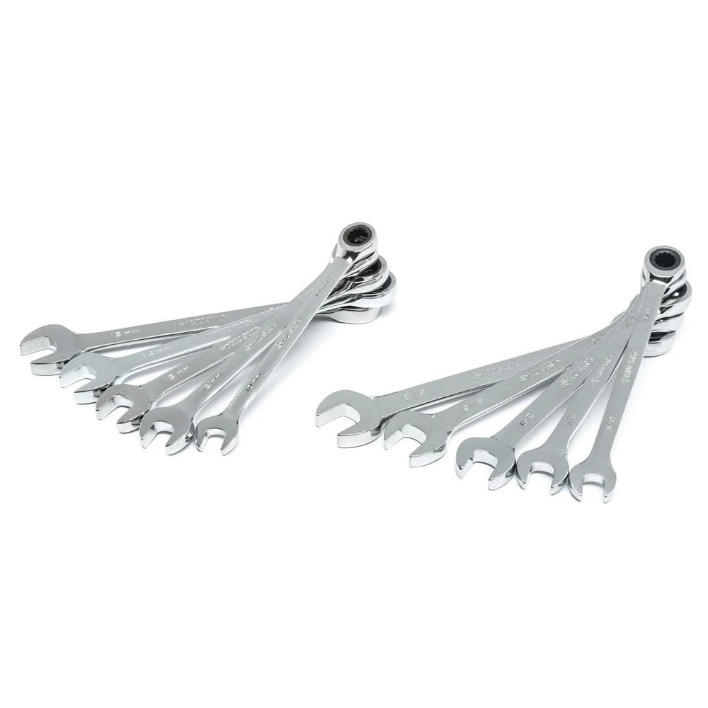 - Set includes 10 ratcheting combination wrenches: (5) SAE: 3/8, 7/16, 1/2, 9/16, 5/8 in. and (5) metric: 10, 12, 13, 14, 15 mm