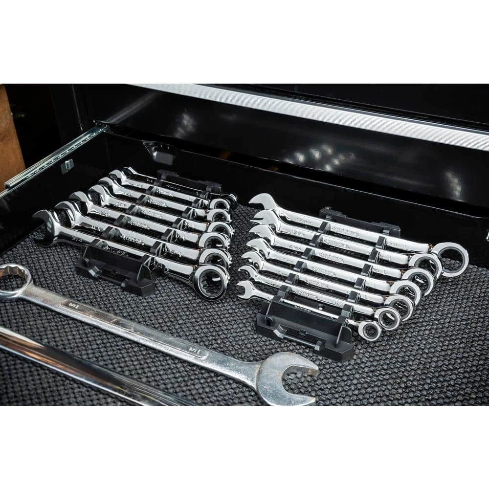 - 7-piece set includes ratcheting wrenches covering sizes 8mm, 10mm, 12mm, 13mm, 14mm, 15mm, 18mm