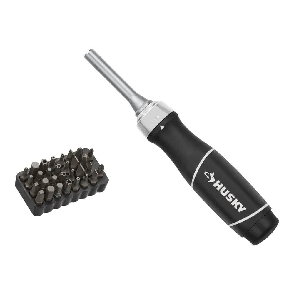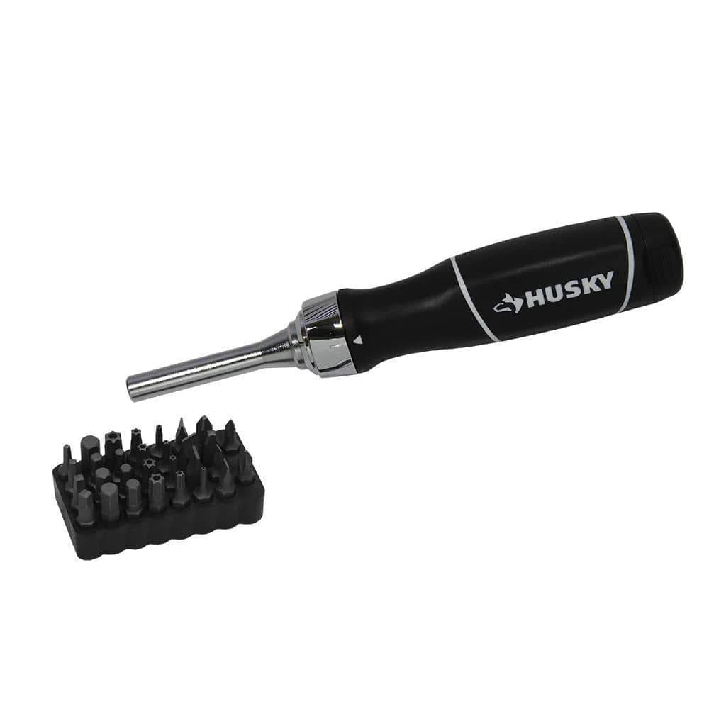 The Husky 30-Piece Ratcheting Screwdriver Set includes 5 Slotted bits, 4 Philips bits, 3 Torx bits, 7 Tamper Resistant Torx bits, 4 Hex bits (SAE), 3 Hex bits (mm) and 4 Square bits. A patented ratchet provides smooth ratcheting action and has greater durability performance. Unique handle design for greater handle torque and comfort.
