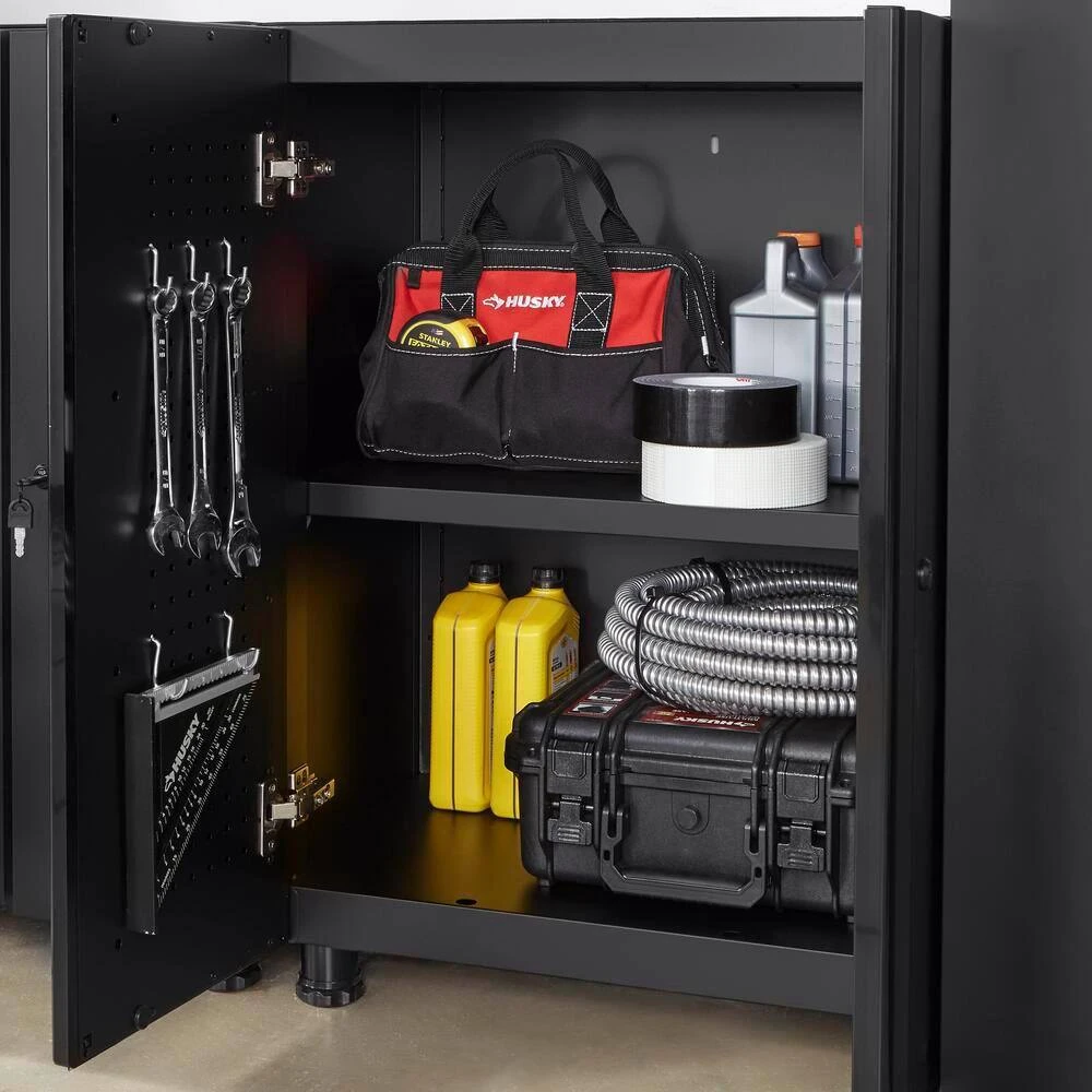 Organize your garage, workspace, basement and more with this Husky Steel Base Cabinet. It features a black finish on the 24-gauge steel to match the rest of your cabinetry and it has an adjustable shelf inside, so you can customize it to meet your needs. The doors have pegboard panels to further help you organize, plus it comes to you fully assembled for a breezy installation.