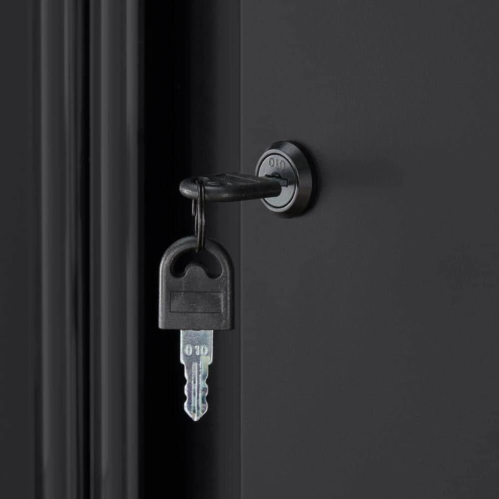 - Sturdy, double-wall doors include pegboard panels for additional storage