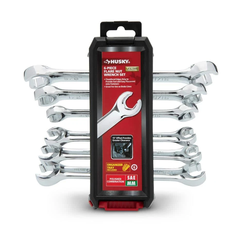 Husky’s 6-piece flare nut wrench set is a must-have to complete the DIY-er’s or professional’s tool box. The unique design of the wrench head allows the tool to be placed over tubing such as brake or fuel lines and engage the fastening nut with less likelihood of stripping the fastener. This set comes equipped with both SAE and metric wrenches covering 12 different fastener sizes to ensure you have the right tool for the job.