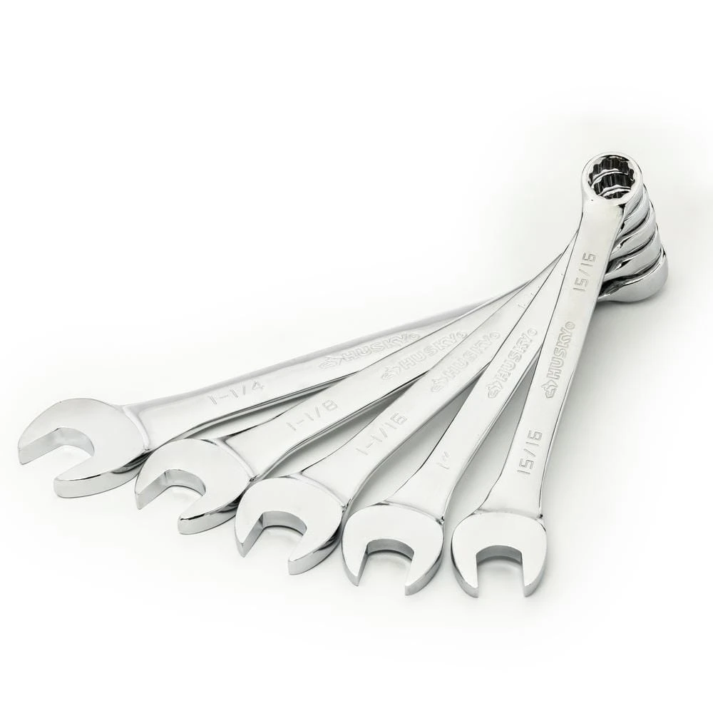 Husky combination wrenches are forged from Chrome Alloy steel for outstanding durability and strength for a lifetime of use. Each wrench has an open-end for access to fasteners in tight spaces and a 12-point box-end to get a secure grip on fasteners when added torque is needed. This set of extra-large combination wrenches is perfect for those large fasteners commonly found on big equipment, engines, or industrial job sites.