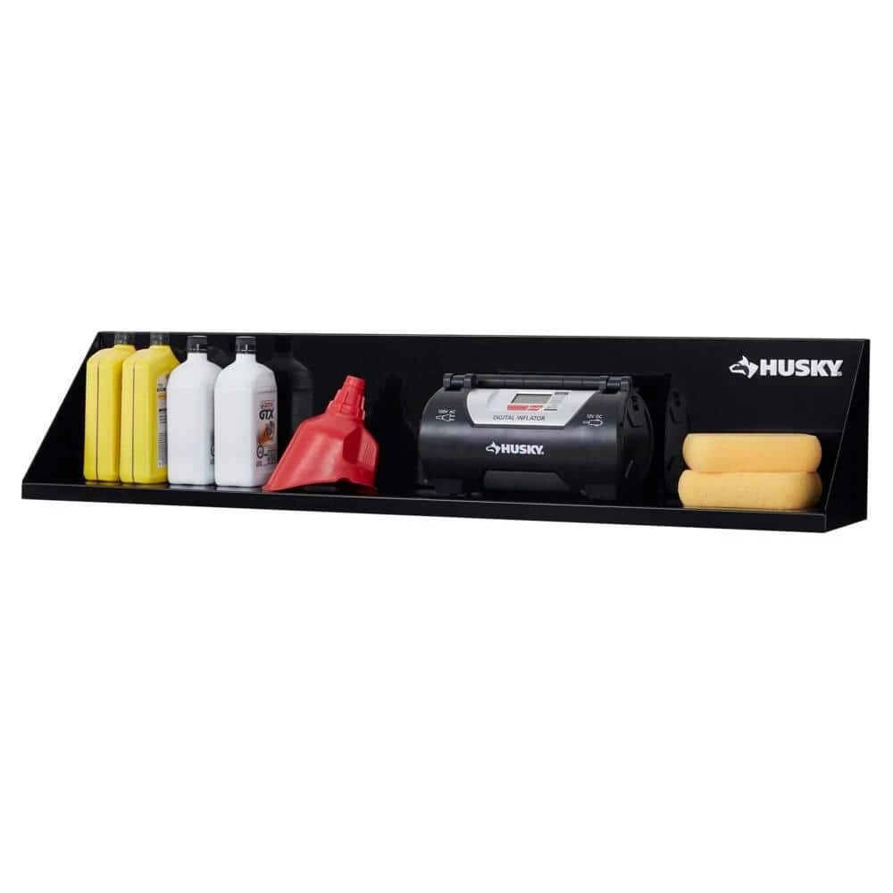 Organize supplies and equipment with this Husky garage wall shelf. Perfect for a garage, mudroom or laundry room, it holds up to 75 lbs. of evenly distributed weight. It features rust and temperature-resistant powder-coated steel construction.