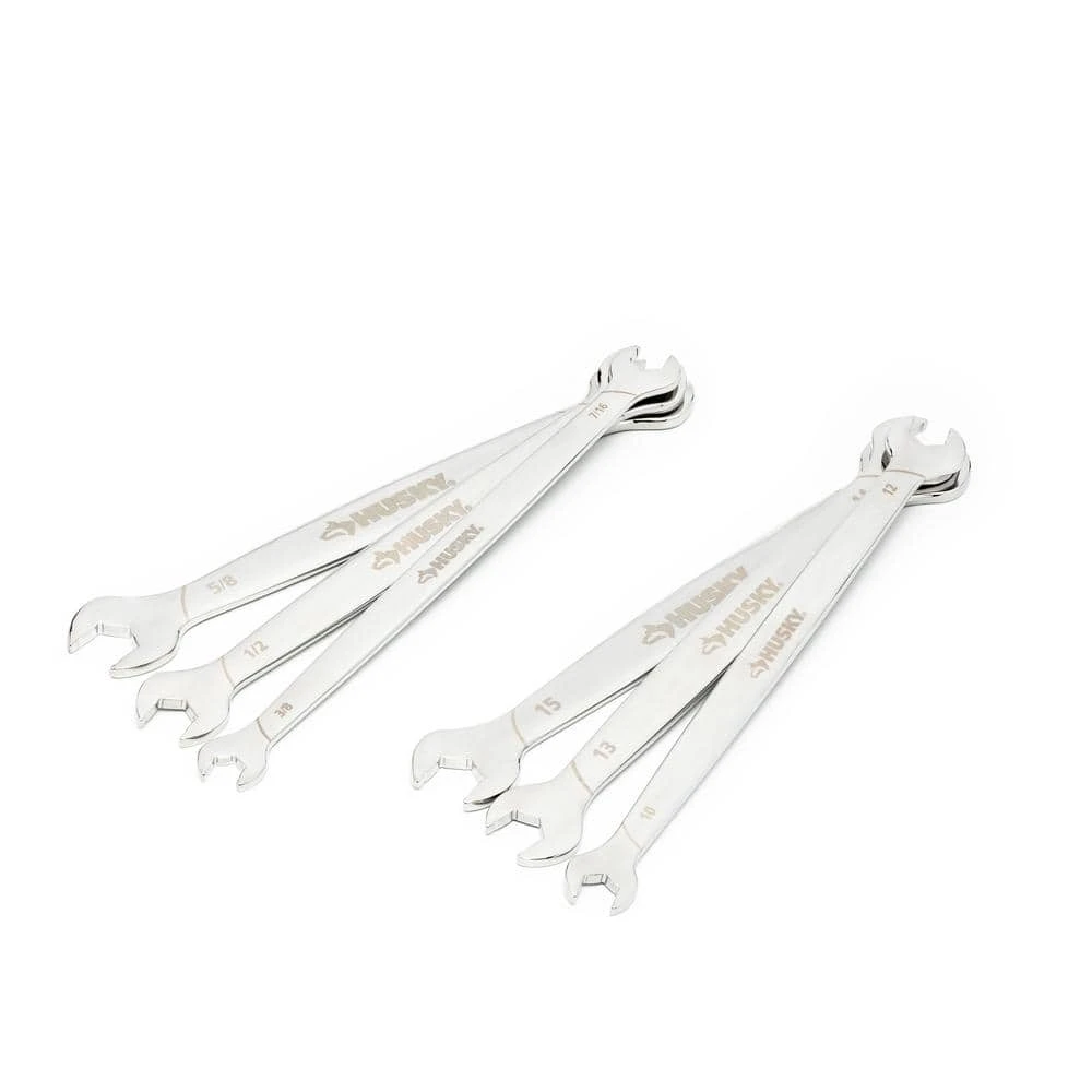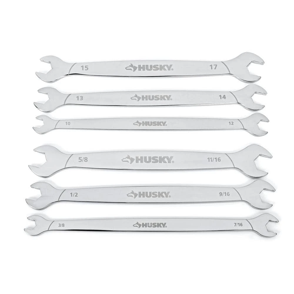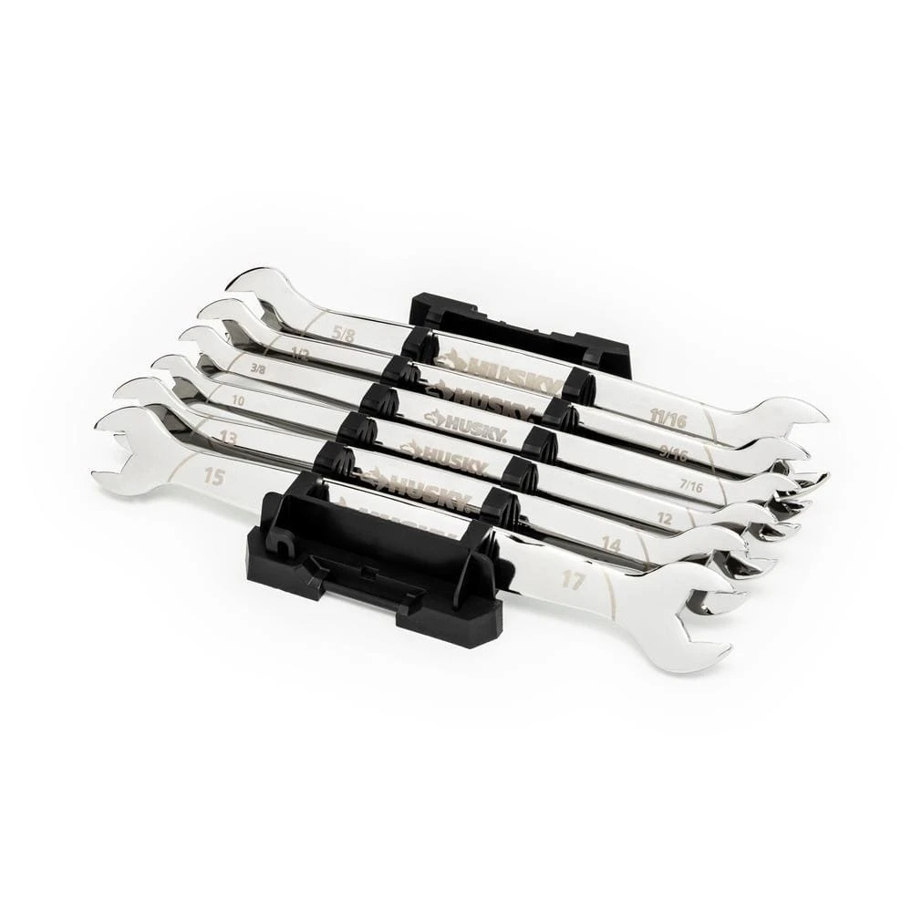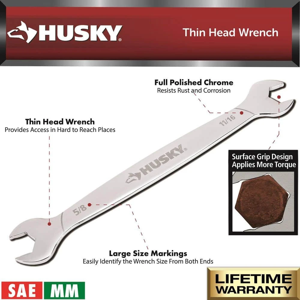 The Husky thin head wrench set is designed with access and strength in mind. The thin head design allows these wrenches to fit in very tight spaces. Also featuring a surface grip design with 80% more grip than a standard wrench.