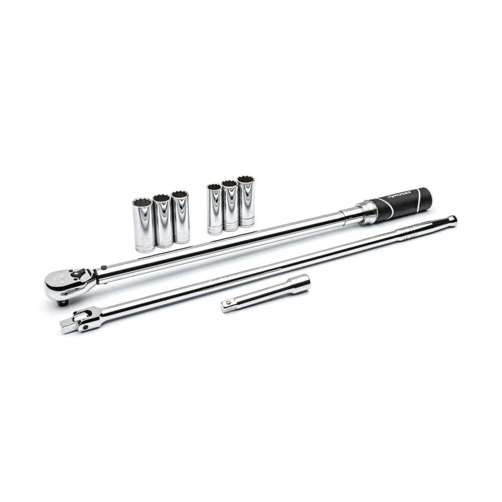The Husky 9-piece Tire Change Kit comes with all the hand tools needed to remove and install tires on most cars, crossovers, SUVs, and trucks. This set packs conveniently in a storage case, keeping all your tire change tools in one location. 6 sockets cover a wide variety of lug nut sizes to cover most, if not all, of the cars in your driveway. Always consult your vehicle’s manual for proper information regarding jack and jack stand positions, as well as the lug nut torque requirements for your specific vehicle.