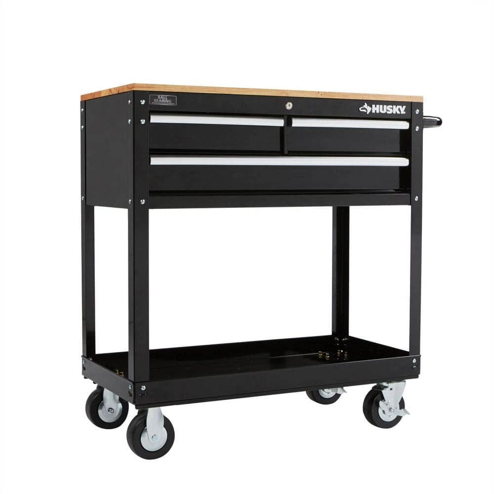 The Husky 36 in. 3-Drawer Tool Cart is the perfect combination of a mobile work center and a mechanic’s tool cart. The fixed wood top is made of solid para-wood, which provides a durable work surface that is both stylish and practical. The 3 drawers have 50 lbs. rated ball bearing slides to hold a variety of tools. The bottom storage tray is reinforced steel for your larger, heavier items. The large, push bar handle and heavy-duty, 5 in. x 2 in. casters allow this cart to be easily moved around your garage, shop, hobby room or office. With no clumsy washers and nuts to deal with, this tool cart can be assembled in minutes with the included bolts and pre-installed speed nuts.