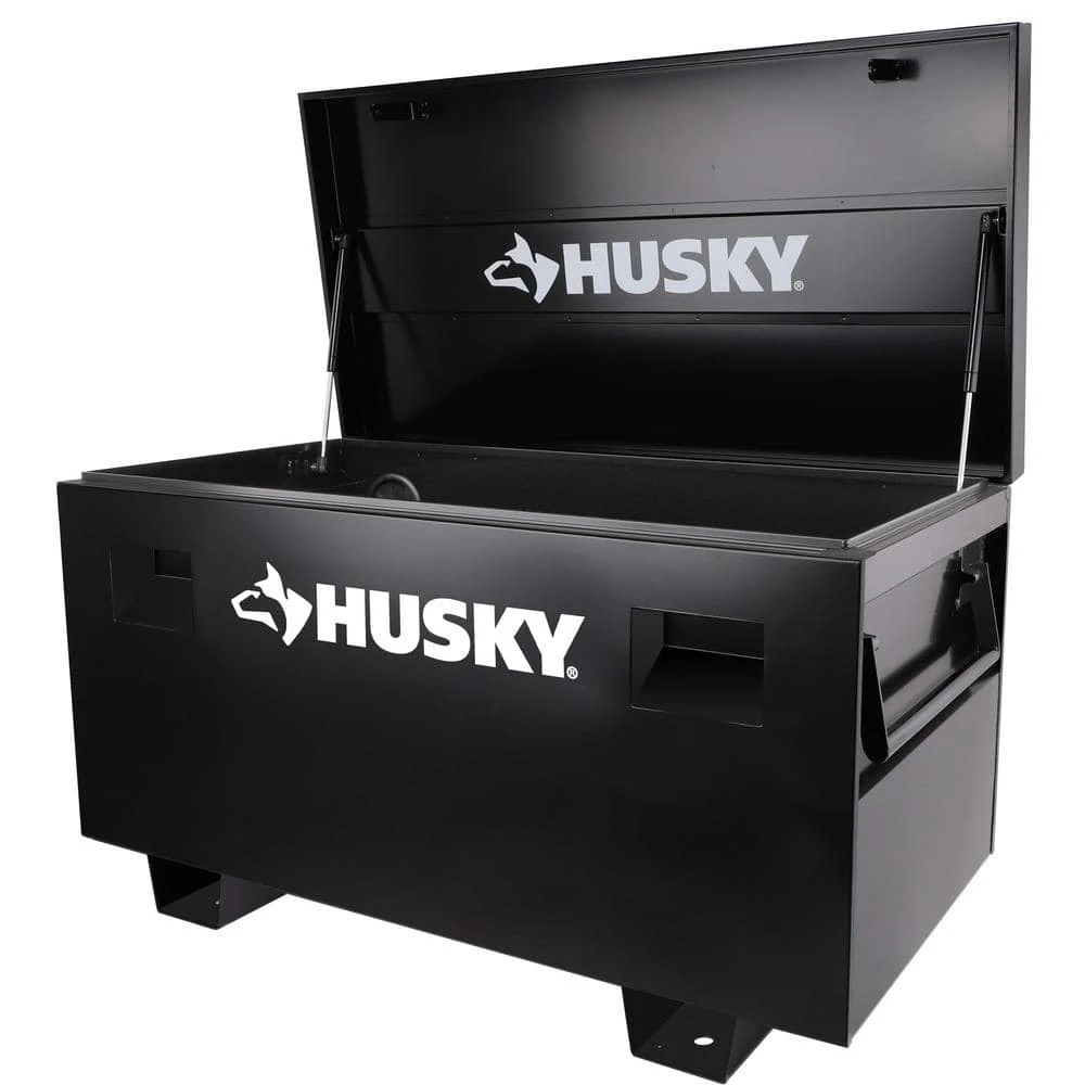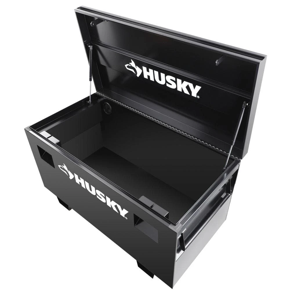 The Husky 48 in. Job Site Tool Box will be a great addition to any job site. Constructed of heavy-duty 16-Gauge steel, this box is built to withstand the demands of the job site. The box is 48 in. W x 24 in. D x 27.6 in. H and has 27,648 cu. in. of total storage. 2-gas struts assist with opening the top lid and securely keep it open while you go in and out of the box. When closed, feel confident that the piano hinge will keep the lid tight and your tools protected from the elements. The recessed locking point allows you to lock the job site box with a padlock and makes it very difficult for someone else to tamper with. Finally, the entire box is easily movable by either the 2 heavy-duty flip-up handles or by utilizing a forklift.