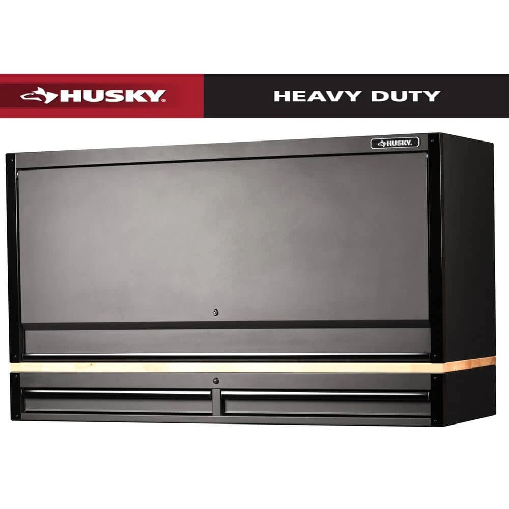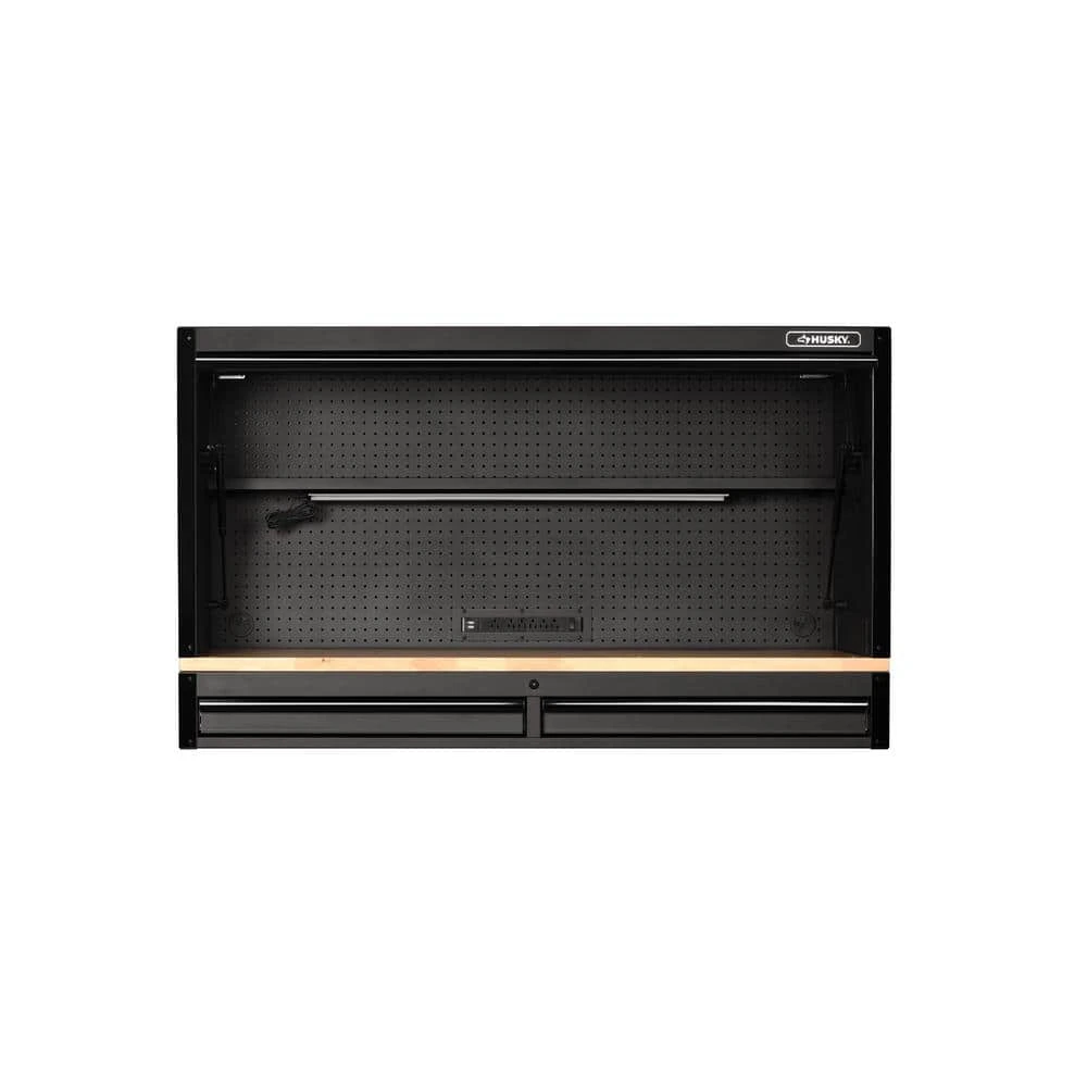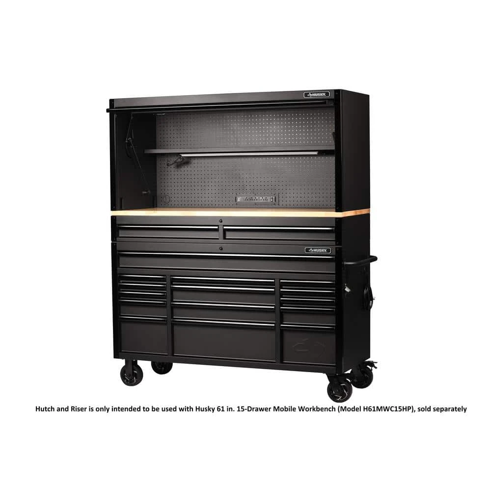 Take your tool storage to the next level to create the ultimate workbench with the new Husky Heavy-Duty 61 in. Hutch with 2-Drawer Riser. This hutch and riser combination is designed to attach to the Husky 61 in. 15-Drawer Mobile Workbench (model H61MWC15HP), sold separately. The 2-drawer riser increases the workbench height to a comfortable 45 in. and allows for 70 in. of clear head height in the hutch. The 2-drawers are equipped with pre-cut liners and glide on 120 lbs. rated soft-closing ball-bearing slides. The large hutch is securely fastened to the riser cabinet with anchor bolts and the flip-up door includes gas struts to assist in opening and safely closing the door. The backwall of the hutch is full pegboard that will allow you to organize and quickly access your most frequently used tools and supplies. There is also a full-width adjustable height shelf with a magnetic 700 Lumens, USB-powered LED light bar that will illuminate your entire work area. Finally, the integrated power strip with 6 outlets and 2 USB ports that will allow you to power up any tools, chargers, or electronic devices and securely store them with the barrel key lock.