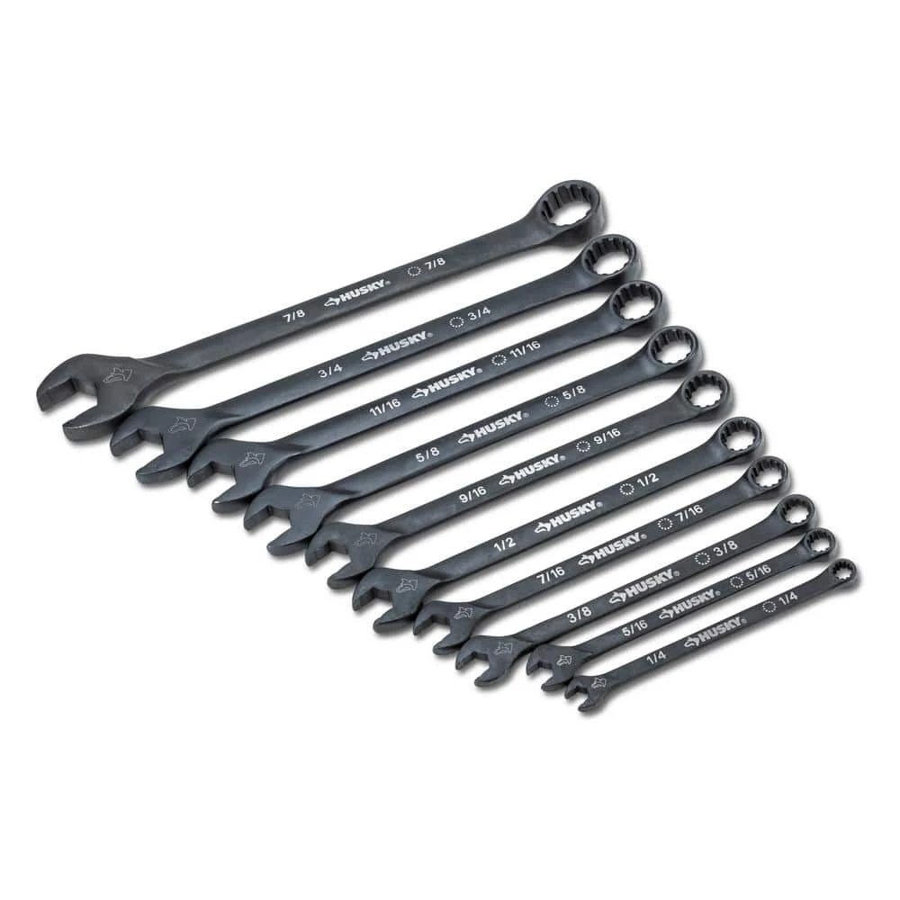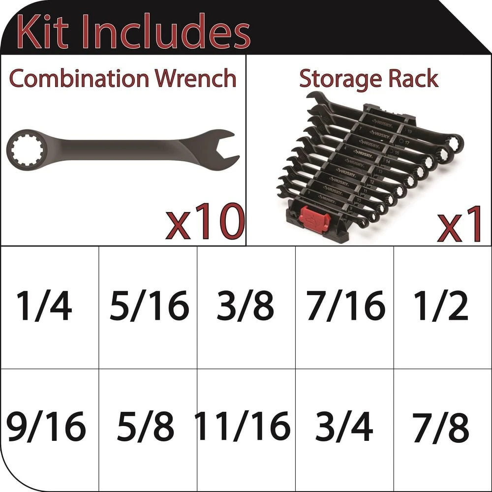 - Set includes 10 SAE wrenches covering sizes: 1/4 in., 5/16 in., 3/8 in., 7/16 in., 1/2 in., 9/16 in., 5/8 in., 11/16 in., 3/4 in., 7/8 in.