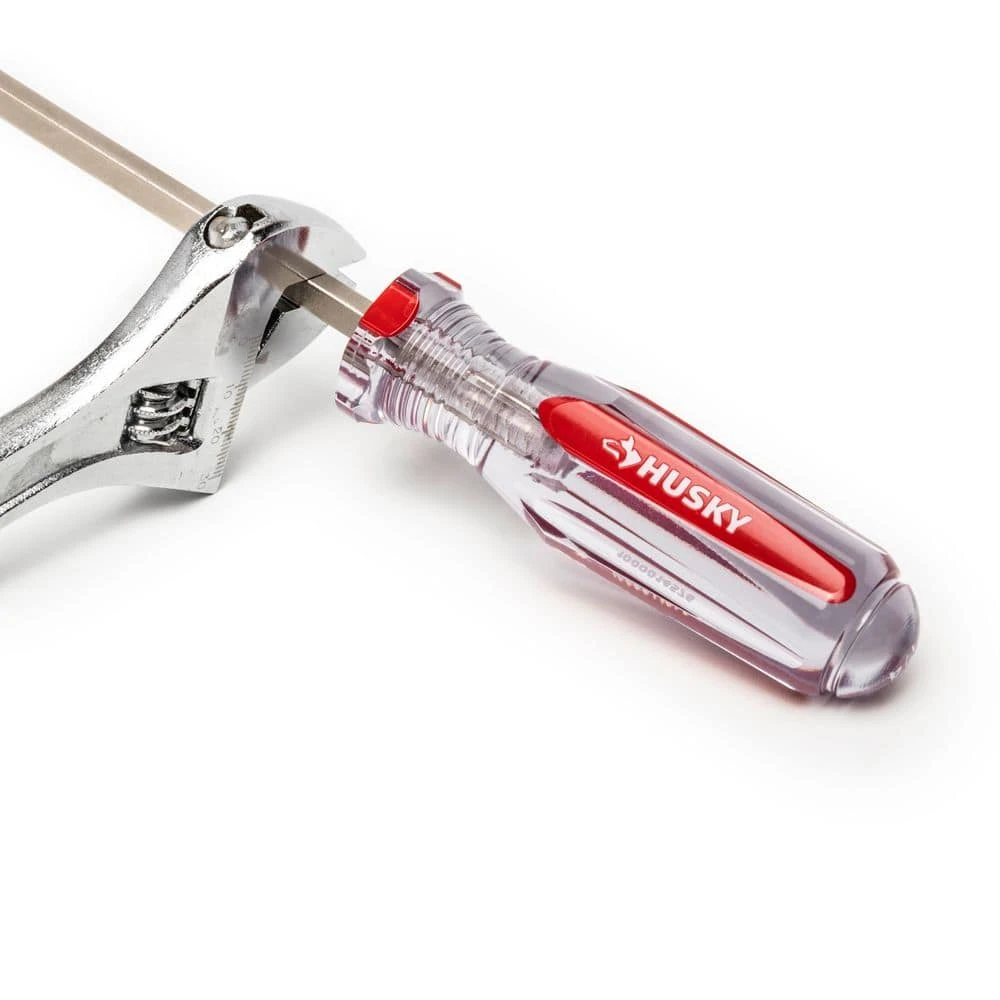 The 25-piece Husky Variety Screwdriver Set features impact- and chemical-resistant acetate handles. The forged steel blades are chrome plated for added corrosion resistance and square to grip with a wrench. The slotted tips are serrated, providing increased grip and reduced slipping to better avoid fastener rounding. The Phillips tips are precision formed to fit the fastener each and every time.